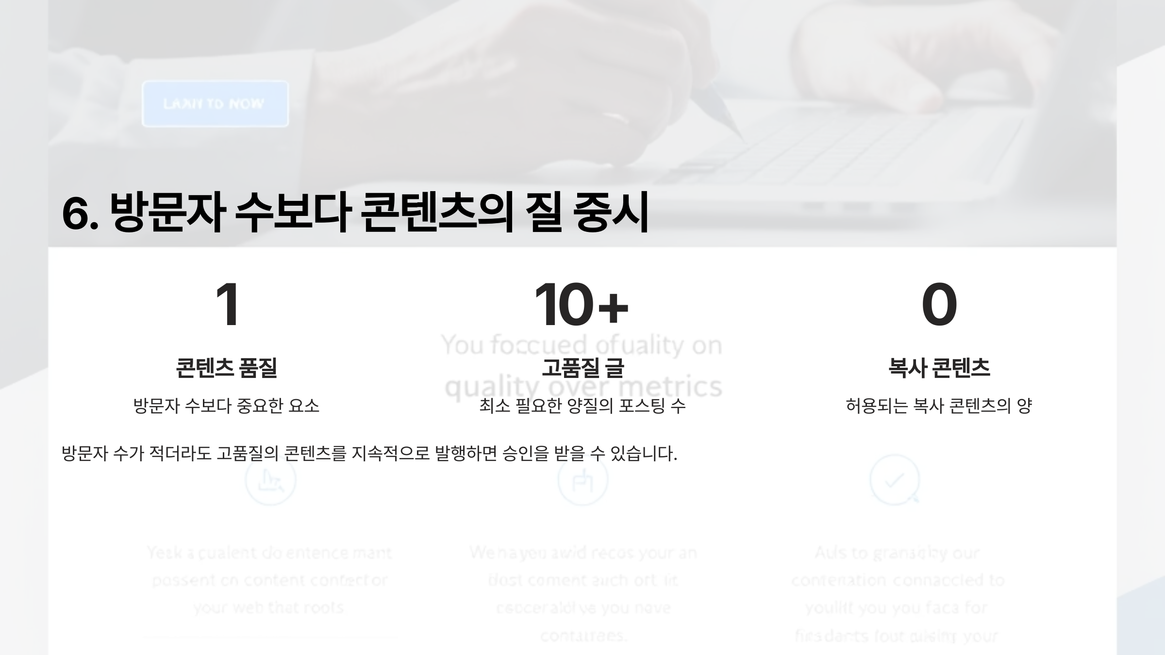 많은 사람들이 애드센스 승인을 위해 높은 방문자 수가 필요하다고 생각하지만, 실제로는 콘텐츠의 질이 더 중요합니다. 방문자 수가 적더라도 고품질의 콘텐츠를 지속적으로 발행하면 승인을 받을 수 있습니다.