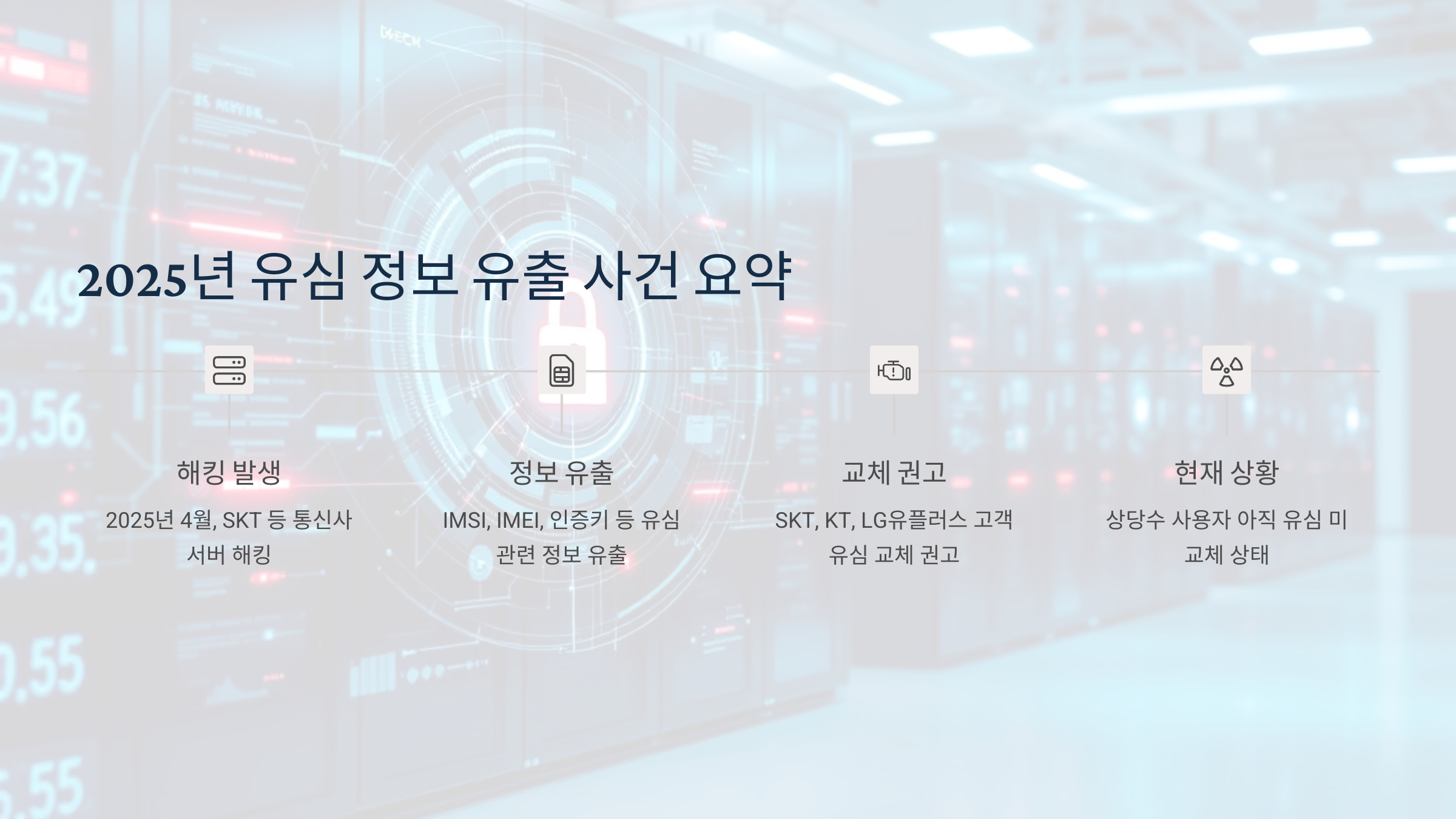 2025년 4월, SKT를 포함한 통신사 서버에서 IMSI, IMEI, 인증키 등 유심 관련 정보가 해킹되었습니다.