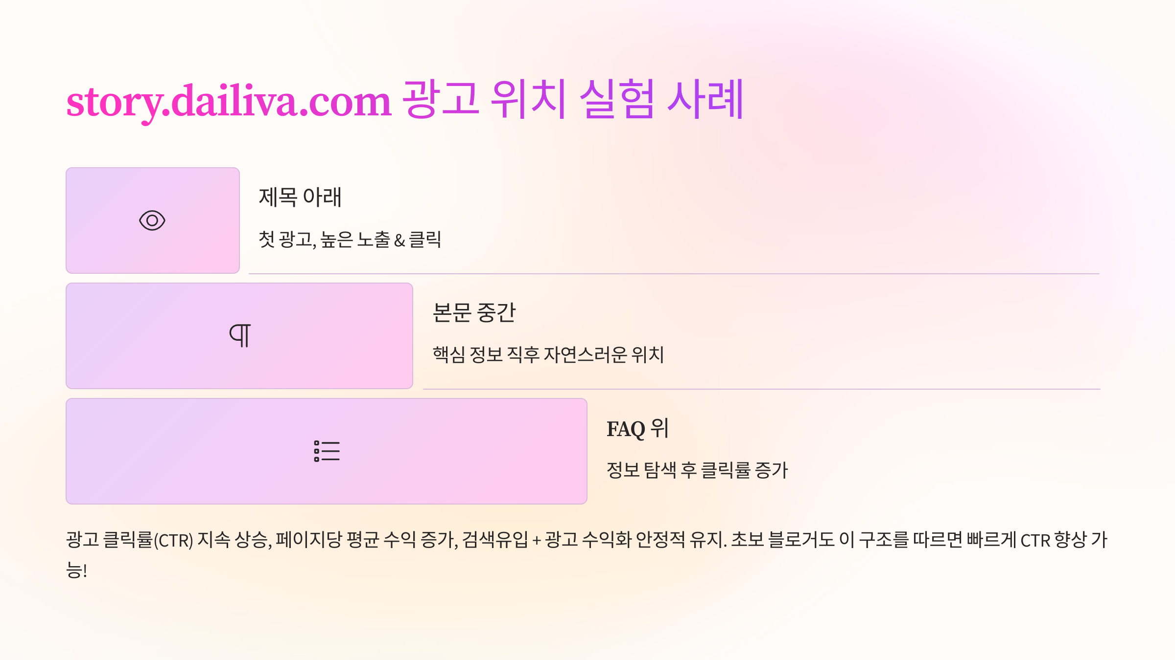 story.dailiva.com에서는 앞으로도 클릭률 상승과 검색 유입을 동시에 잡을 수 있는 광고 위치와 글쓰기 전략을 지속적으로 공유하겠습니다. 함께 성장하며 수익을 키워갑시다!