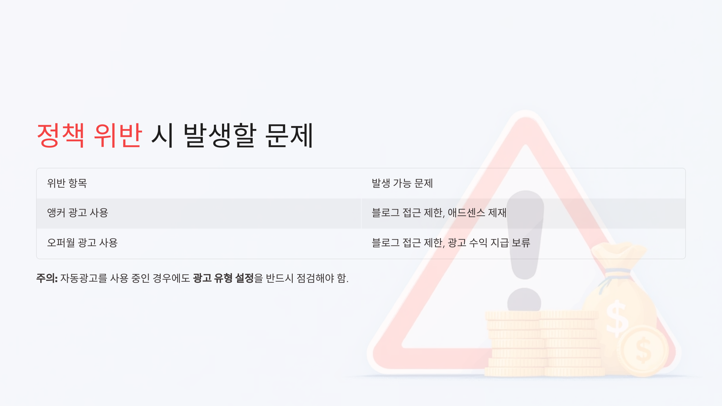 | 오퍼월 광고 사용 | 블로그 접근 제한, 광고 수익 지급 보류 |