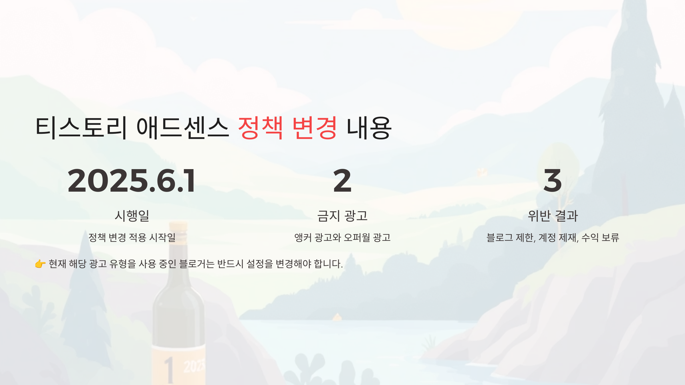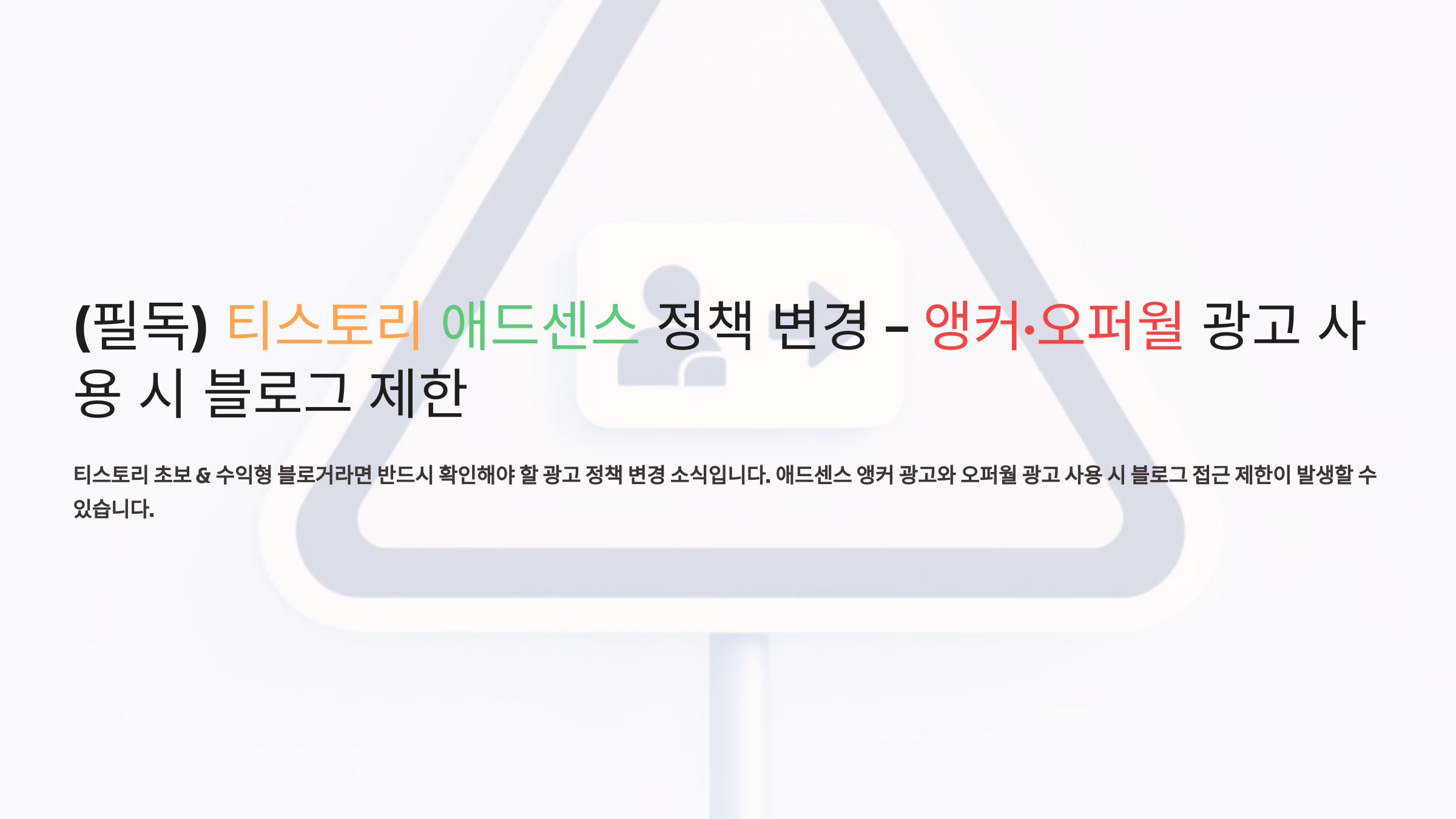 티스토리 초보 & 수익형 블로거라면 반드시 확인해야 할 광고 정책 변경 소식입니다. 애드센스 앵커 광고와 오퍼월 광고 사용 시 블로그 접근 제한이 발생할 수 있습니다.