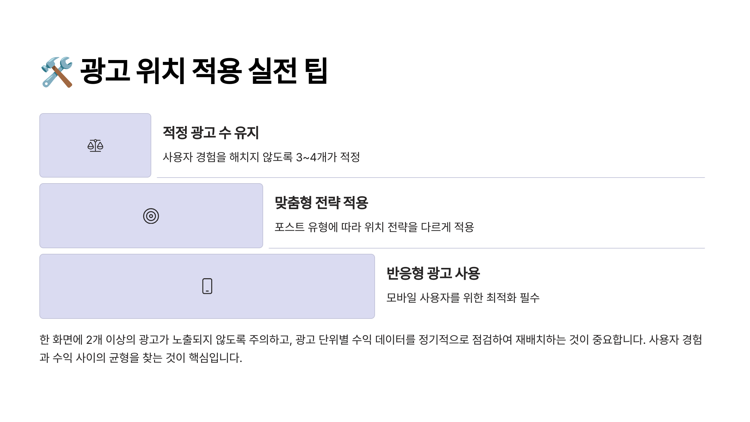 사용자 경험을 해치지 않도록 3~4개가 적정하며, 한 화면에 2개 이상 광고가 노출되지 않도록 주의합니다. - 포스트 유형에 따라 위치 전략을 다르게 적용: