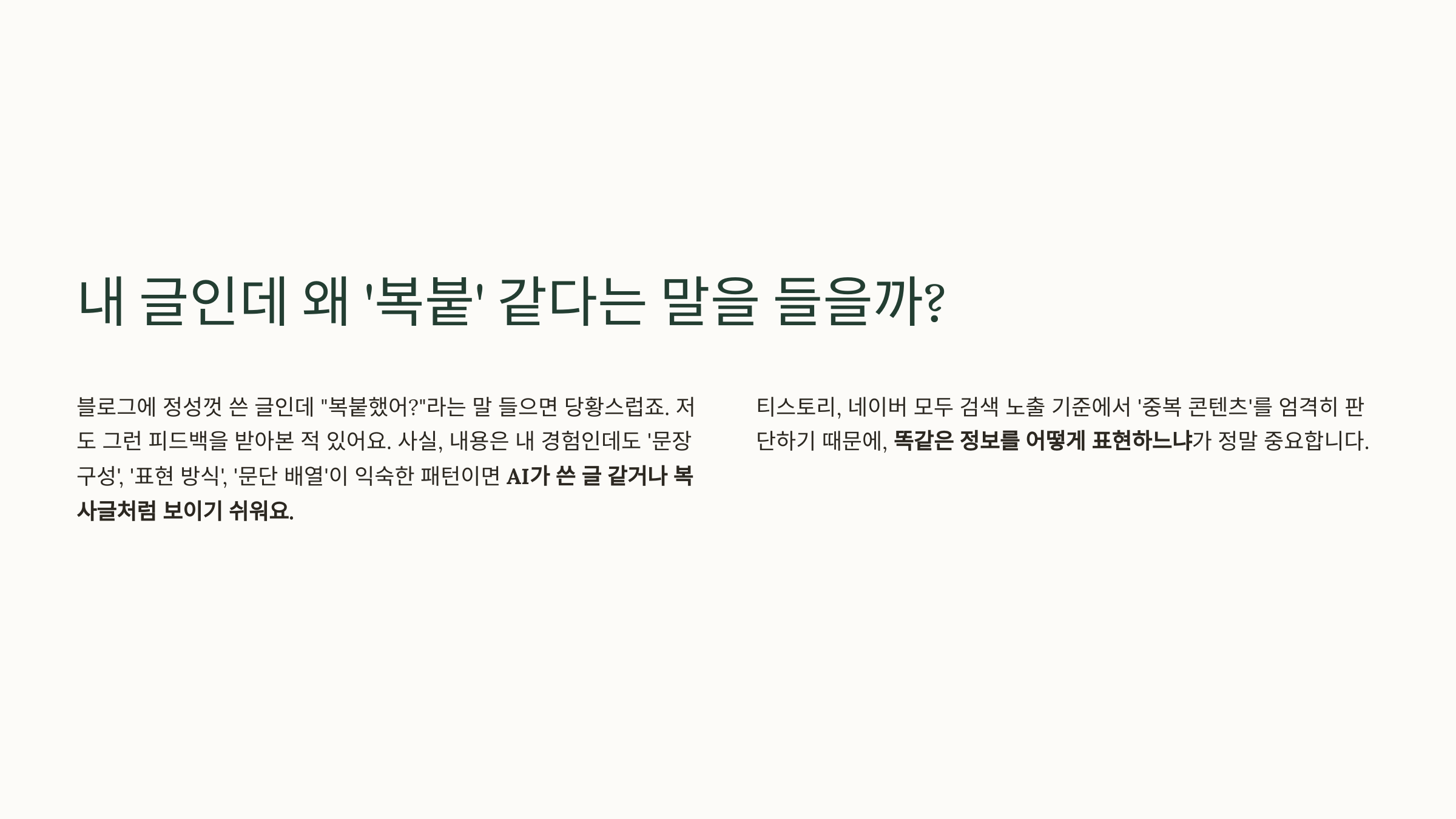 "직접 쓴 글인데 왜 복사한 것처럼 보일까요? 티스토리와 네이버 검색에서 살아남는 나만의 글쓰기 비법을 알려드릴게요!"