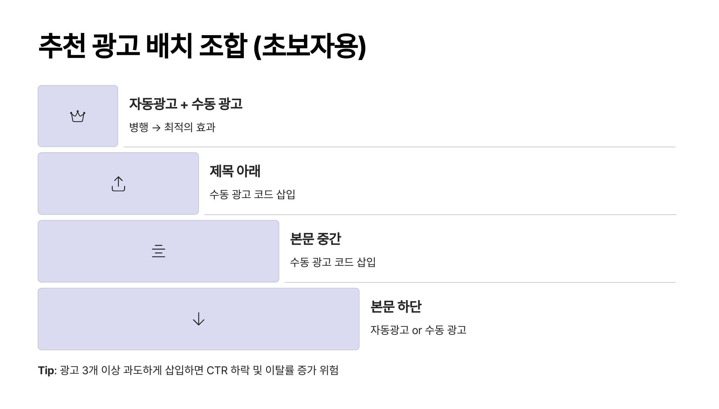 Tip: 광고 3개 이상 과도하게 삽입하면 오히려 CTR 하락 및 페이지 이탈률 증가 위험.
