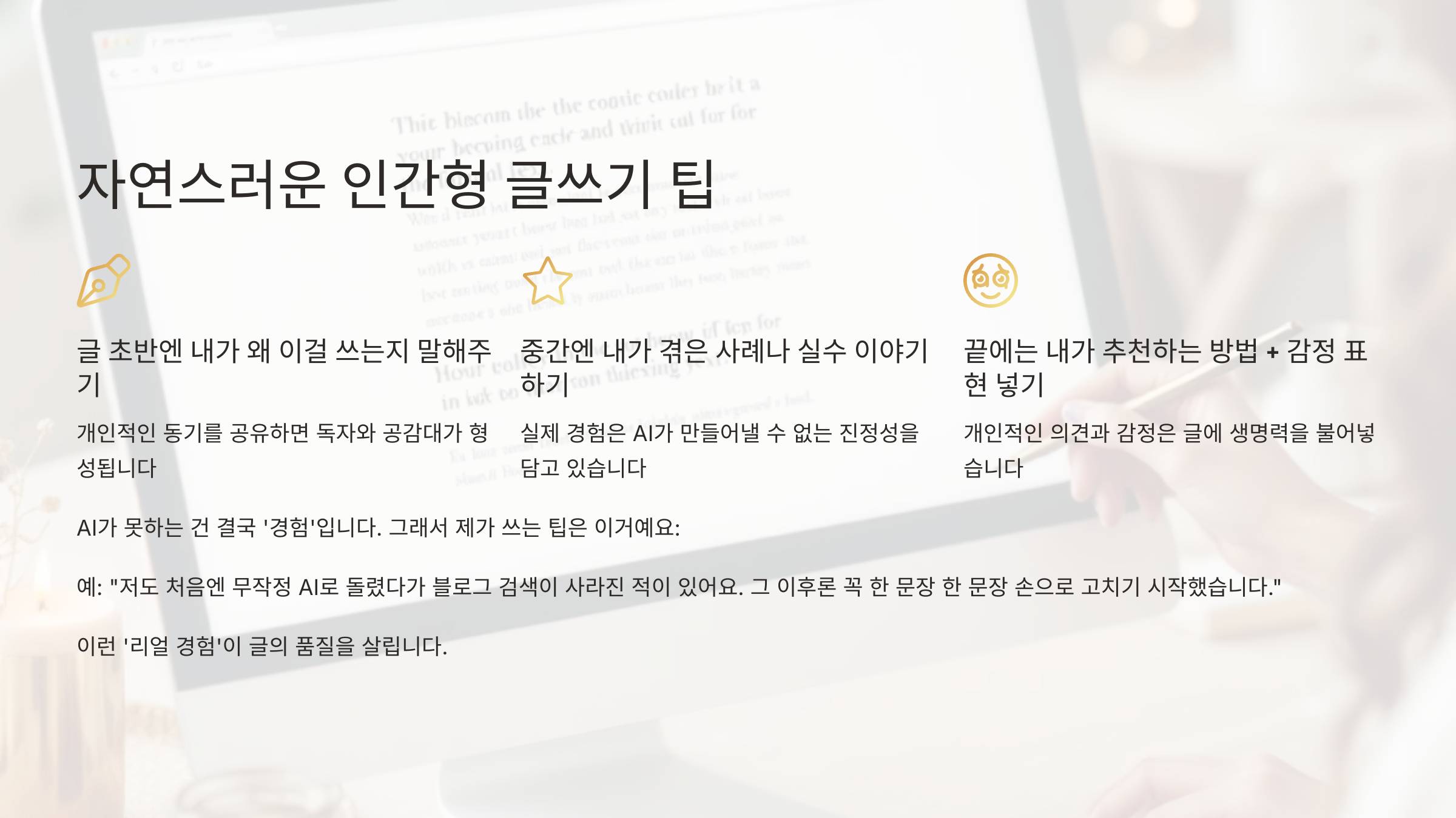 “저도 처음엔 무작정 AI로 돌렸다가 블로그 검색이 사라진 적이 있어요. 그 이후론 꼭 한 문장 한 문장 손으로 고치기 시작했습니다.”