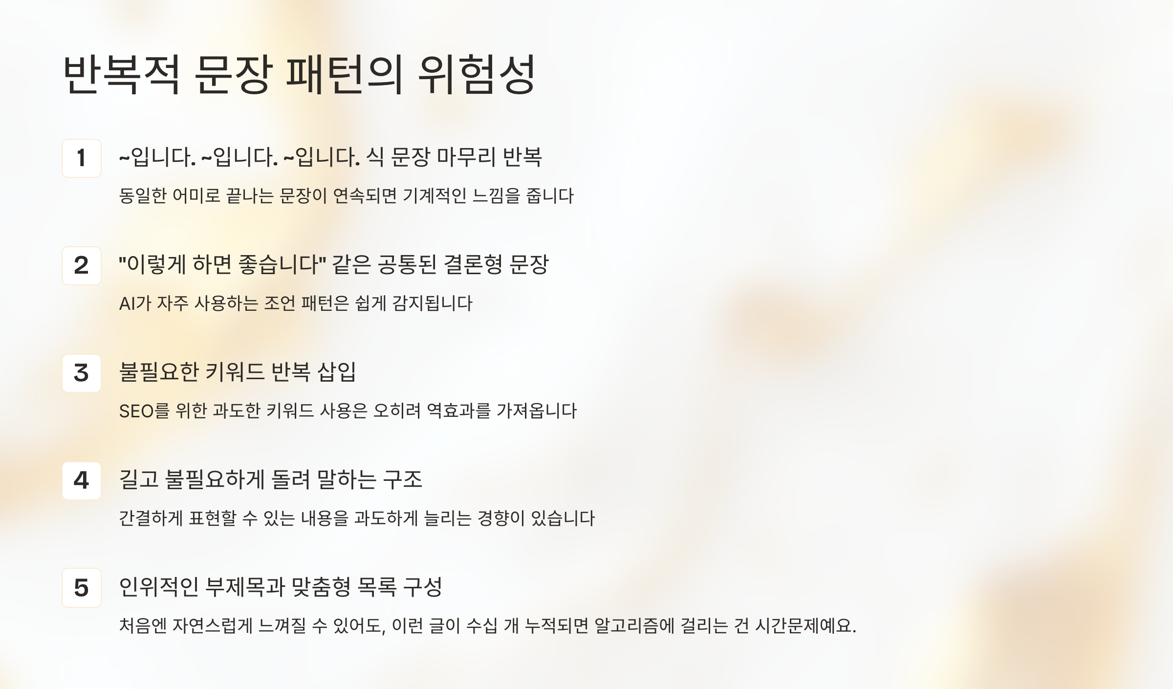 다음과 같은 패턴은 AI 글에서 흔하게 보이며, 반복될수록 저품질 위험이 커져요.