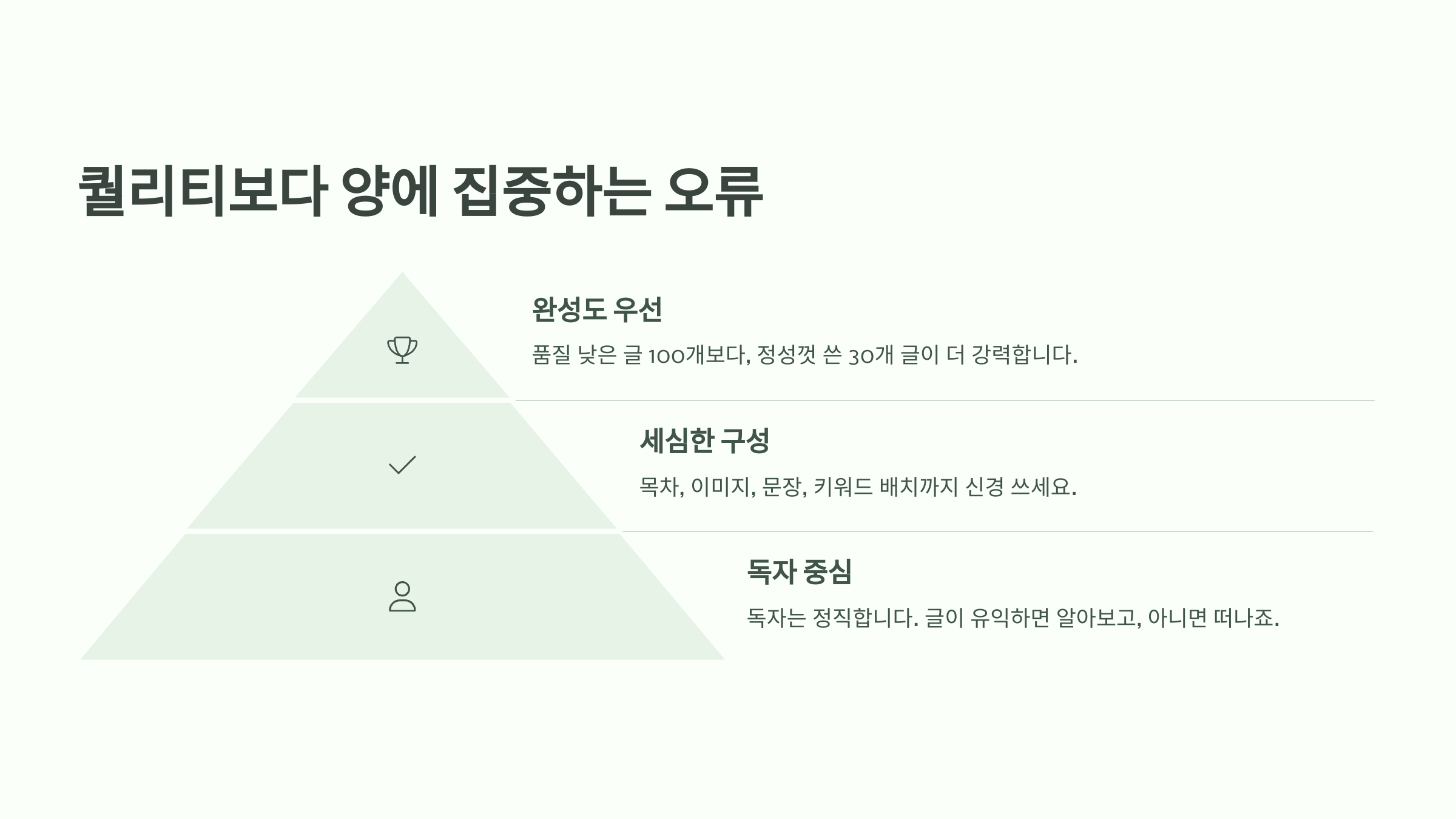 “매일 한 개씩 써야 해!” 이 다짐, 오히려 블로그를 망칠 수도 있어요. 품질 낮은 글 100개보다, 정성껏 쓴 30개 글이 더 강력합니다. 글 하나를 써도 목차 구성, 이미지, 문장 다듬기, 키워드 배치까지 신경 쓰는 게 SEO에 훨씬 유리해요. 독자는 정직합니다. 글이 유익하면 알아보고, 아니면 떠나죠. 숫자보다 완성도가 우선이에요!