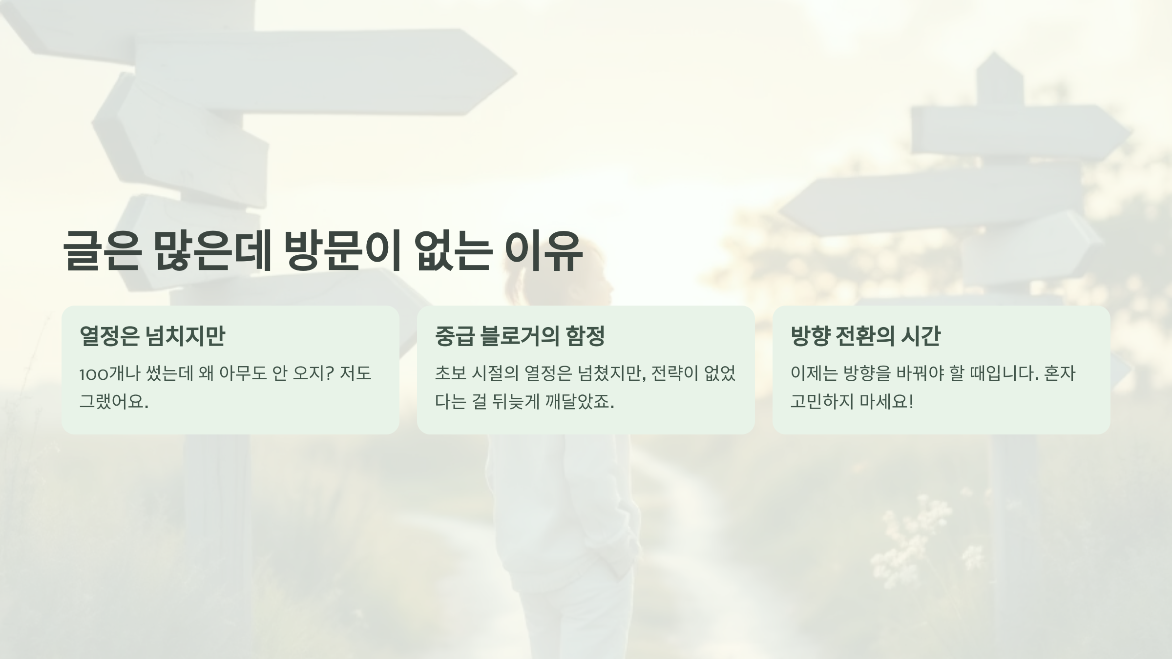 “100개나 썼는데 왜 아무도 안 오지?” 저도 그랬어요. 하루하루 성실히 글을 썼고, 나름 정성도 들였는데… 조회수는 그대로. 이게 바로 중급 블로거의 함정이에요. 초보 시절의 열정은 넘쳤지만, 전략이 없었다는 걸 뒤늦게 깨달았죠. 이제는 방향을 바꿔야 할 때입니다. 혼자 고민하지 마세요, 같은 실수 반복 중일지도 몰라요!