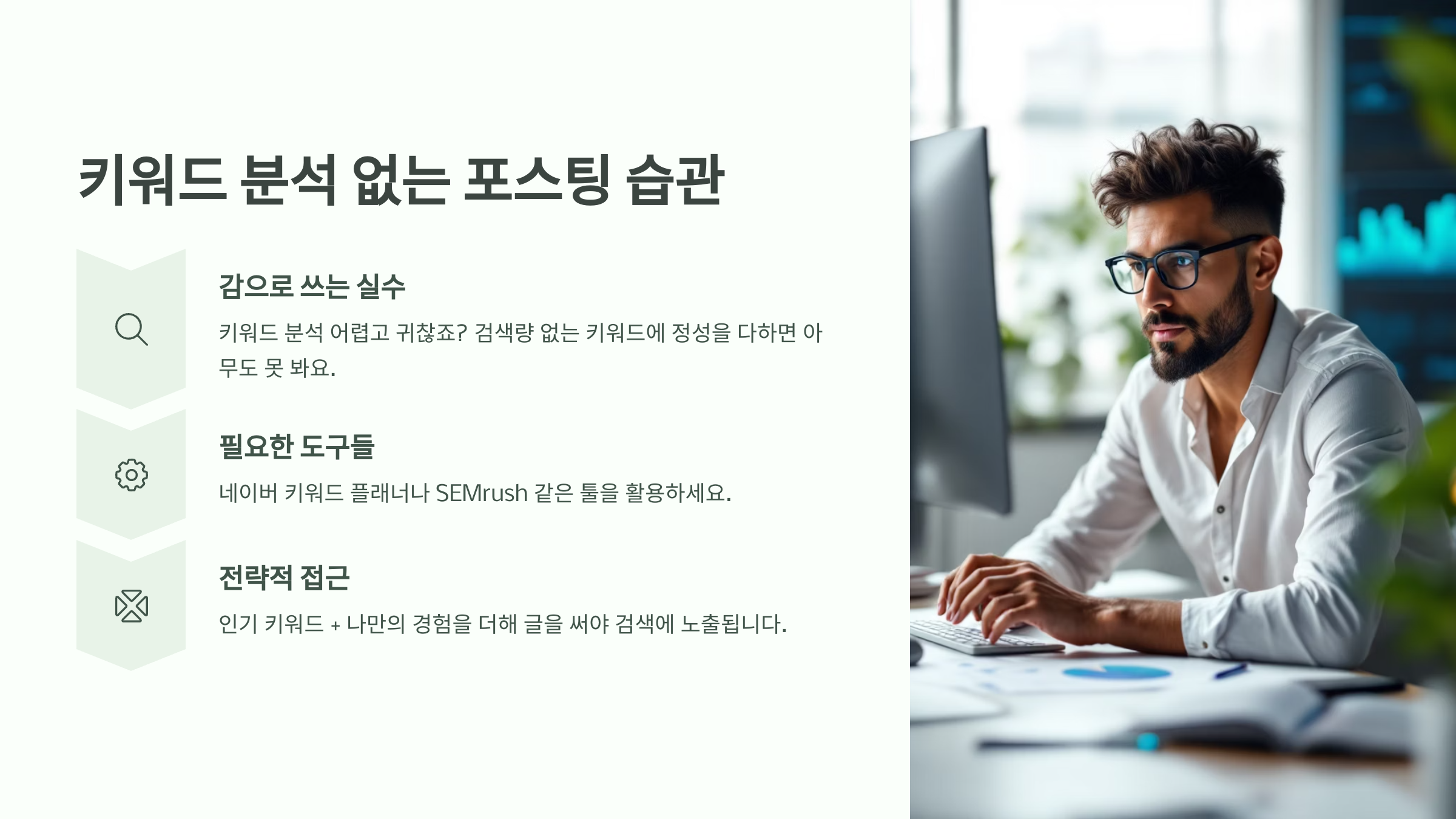 솔직히 키워드 분석 어렵고 귀찮죠? 그래서 감으로 쓰는 경우 많아요. 근데 이게 문제예요. 검색량 없는 키워드에 정성을 다하면… 아무도 못 봐요. 네이버 키워드 플래너나 SEMrush 같은 툴 활용해서 ‘사람들이 검색하는 주제’를 찾아야 해요. 인기 키워드 + 나만의 경험을 더해 글을 써야 검색에 노출됩니다. 이건 선택이 아니라 필수예요!