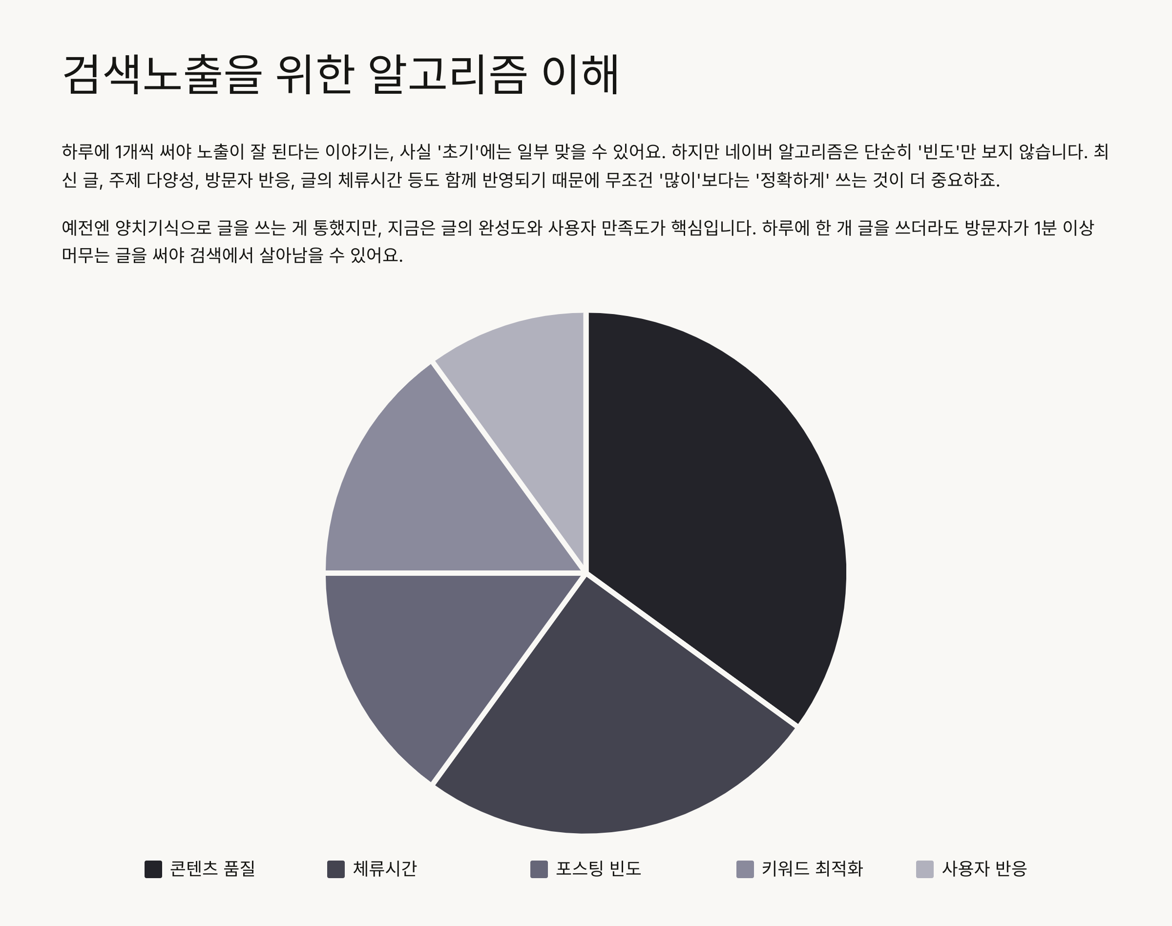 하루에 1개씩 써야 노출이 잘 된다는 이야기는, 사실 ‘초기’에는 일부 맞을 수 있어요. 하지만 네이버 알고리즘은 단순히 ‘빈도’만 보지 않습니다. 최신 글, 주제 다양성, 방문자 반응, 글의 체류시간 등도 함께 반영되기 때문에 무조건 ‘많이’보다는 ‘정확하게’ 쓰는 것이 더 중요하죠.