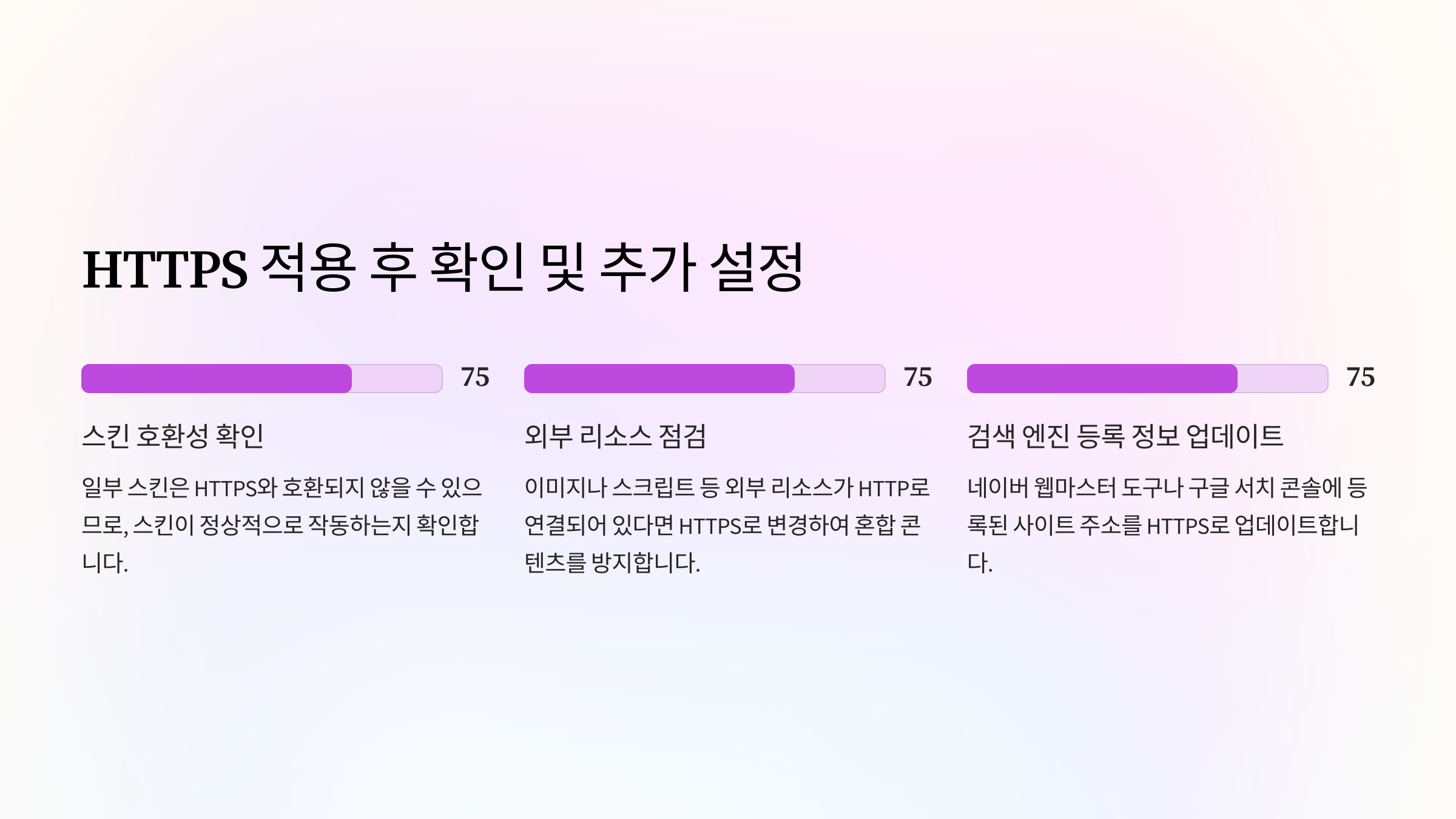 - 검색 엔진 등록 정보 업데이트: 네이버 웹마스터 도구나 구글 서치 콘솔에 등록된 사이트 주소를 HTTPS로 업데이트합니다.