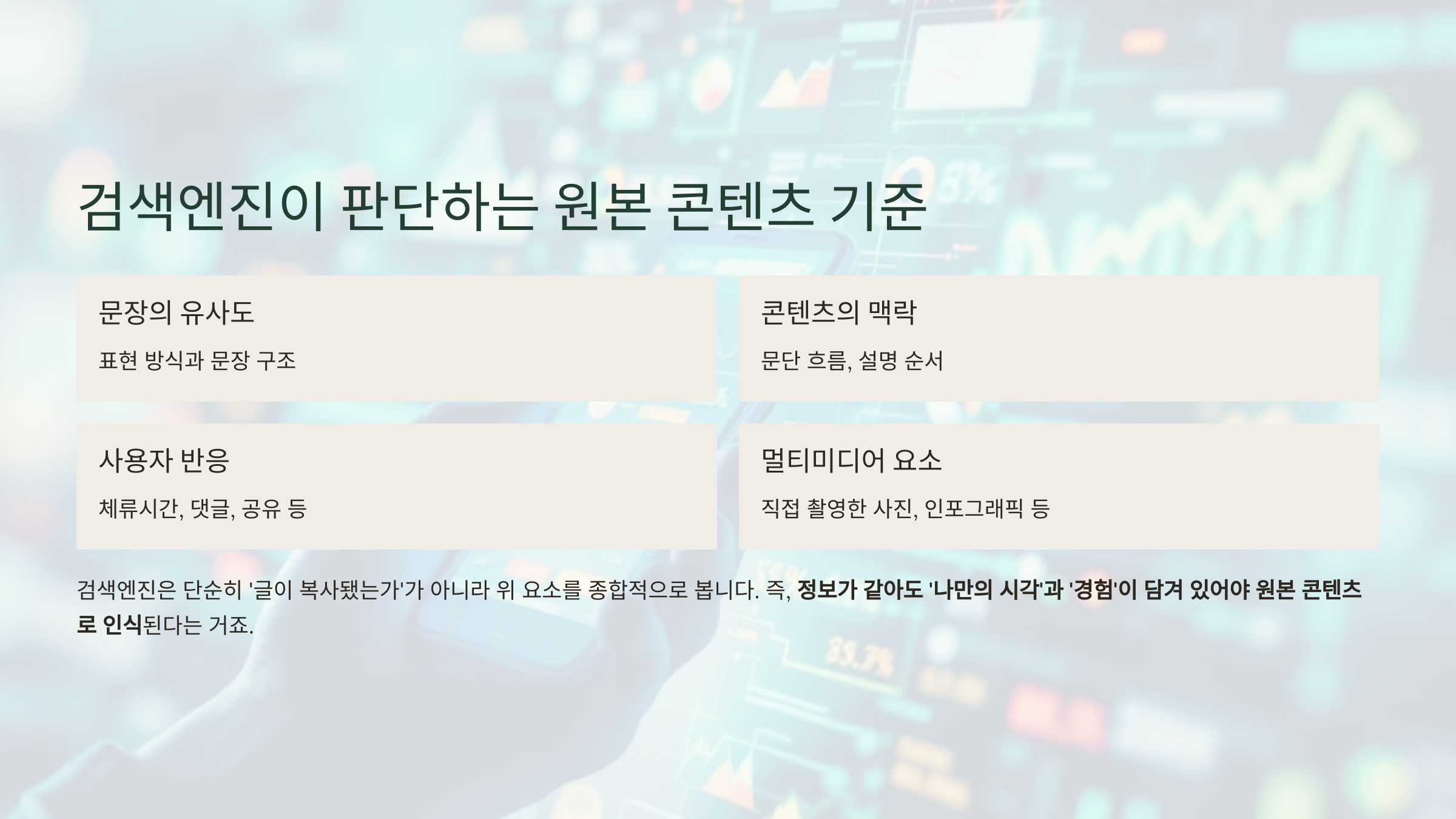 검색엔진은 단순히 ‘글이 복사됐는가’가 아니라 다음 요소를 종합적으로 봅니다.